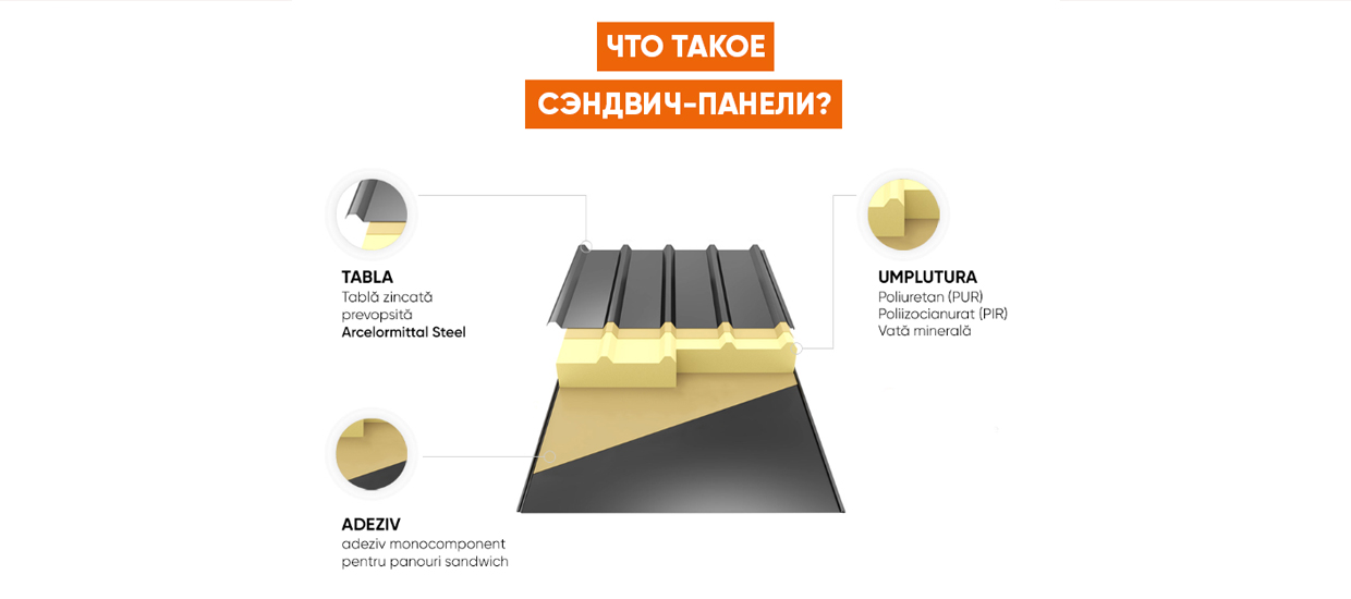 Сэндвич-панель — это современный строительный материал, используемый для стен и крыш зданий, состоящий из 3-х слоев: двух металлических листов, образующих облицовку, и изоляционного наполнителя между ними, который является сердцевиной панели — это может быть: